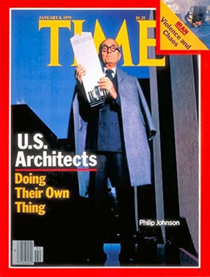 罗伯特-斯特恩的这种做法是模仿1979年1月《时代》杂志封面的照片。那张照片是菲利普-约翰逊拿着一个美国电话电报公司大厦的模型。