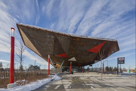 这个车站使用耐候钢,在形状和大小上相互反映。车站雨棚也使用科滕钢,有巨大的悬臂屋顶,其表面种植牧草,为候车的旅客提供遮阴。