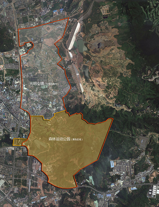 光明小镇森林运动公园规划用地位于光明小镇南侧,规划面积约6平方公里,占小镇总规划面积的50%,具有非常关键的生态价值和公共休闲服务价值。