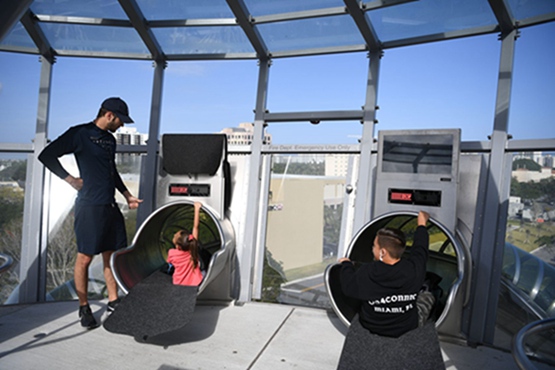 两名比赛的下滑者的速度最高可以达到每小时15英里,滑落到地面一个封闭的“桶”中。这个“桶”内有缓冲装置,管道底部是金属的,顶部是透明的。