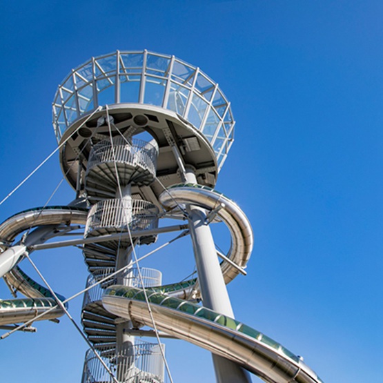 游客从入口通过一个螺旋楼梯,爬上“下滑塔”的第九层,然后进入两条方向相反的螺旋形滑道向下滑行。