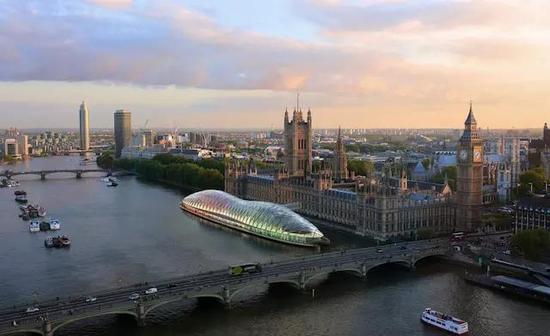 还有两个项目正在伦敦发生,Denizen Works的漂浮教堂和社区中心,以及Gensler为英国议会大厦提出的临时建筑——一个漂浮在泰晤士河上的巨型“泡泡”。