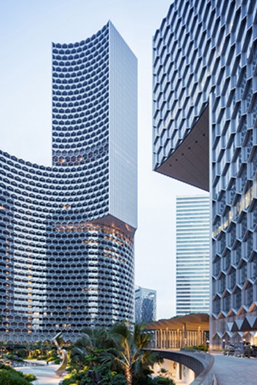 “双子塔”最具特色的也许是蜂巢般的表面。奥雷-舍人说,蜂窝状表现了大厦的动态曲率,同时成为一个环境的工具。