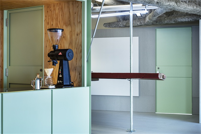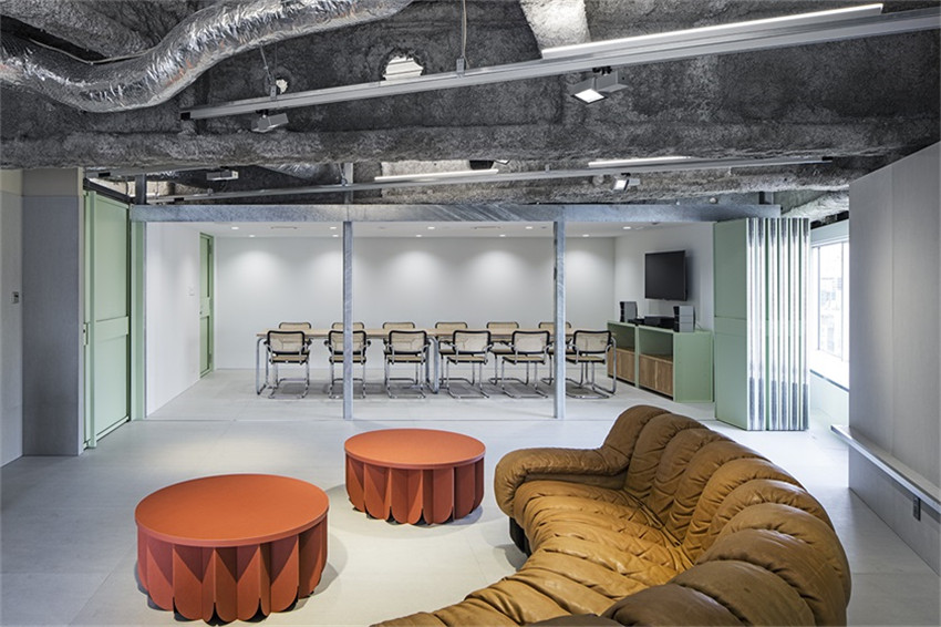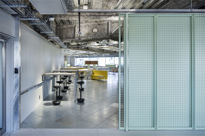 当粗犷工业风与科技感元素结合时,将碰撞出什么样的风格呢?有别于一般Loft精神,由日本建筑团队Shota Miyashit主导的音乐品牌办公室,运用裸露管线、银色铝地板大玩未来工业风。为了使空间纳入更多日光,即以会议室为主轴,运用放射型格局整并各区域,营造宽敞且自由私密兼具的效能空间。在风格形塑部分尽管元素丰富,仍藉由粗犷水泥、灰银波浪板、裸露金属管线彼此整合动线,并搭配粉嫩系铁架屏帘、木质家具与皮革软件,使工作区域能稳定理性基调之余,也彰显室内感性温度。