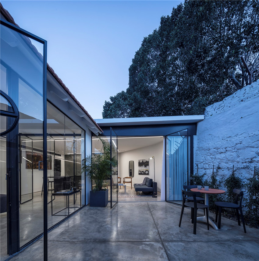 面向庭院的两个方向都设置了大片的玻璃窗,比利时风格的枢轴窗使建筑面向其明亮庭院的同时也保持了一定的私密性。Melamed 为面向街道的窗户选择了当地典型的木制百叶保证良好的空气流通,将室内空间开放,保持建筑的通透性并将盥洗室隐藏在厨房区域的背后。