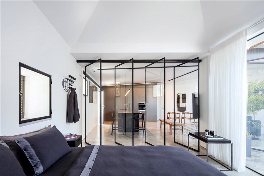 为了创造一个干净而舒适的现代空间,建筑选择了灰色作为主色调,同时采用了许多不加装饰的天然材料。室内空间与庭院均选择了抛光混凝土地面,盥洗室使用了灰色的瓷砖,厨房与卧室中的木制家具也被涂成了灰色。厨房中岛被涂成黑色,作为空间的焦点,也为了呼应其上的黑色花岗岩台面。比利时风格的铁艺枢轴窗以及通往庭院的门都被涂上了一层煤黑色。庭院里设置了一套木质家具,并种植了多种乔木和灌木。Melamed为业主创造了一个在城市中心的避世乐园。