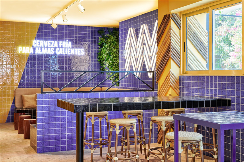 该项目位于圣安东尼奥的尽头,占地面积超过200平方米,酒吧主要由一个海边露台构成。设计中,Masquespacio团队主要考虑三种颜色的混合搭配:蓝紫色,松石绿和芥末黄,并搭配植物在其中,创造出令人愉快的现代设计风格。另一方面,设计师通过家具的布局和设计,利用高脚凳和低脚凳来划分不同类型的放松空间,实现运动和美食相结合的酒吧理念,同时,高脚凳座位也为顾客提供了理想的海景视野。
