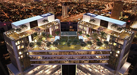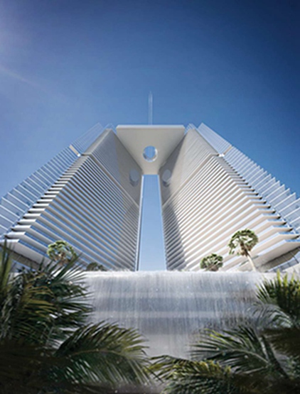 作为关键的设计元素,一个85英尺(26米)高的瀑布将围住前面的入口和服务区,两幢楼房之间的“天桥”上将有一个屋顶游泳池。
