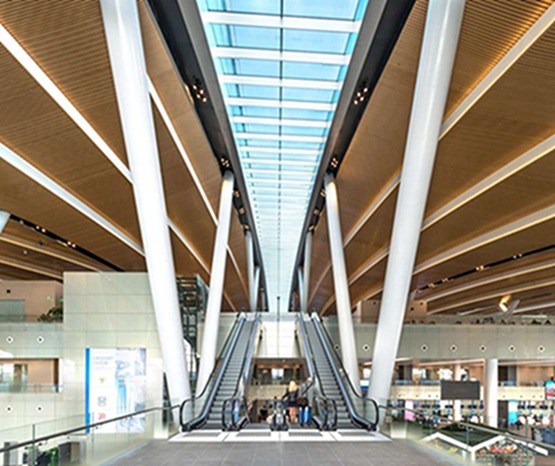 在航站内,屋顶拱门和八米宽的天窗在视觉上分隔了空间,表示国际和国内旅客区。