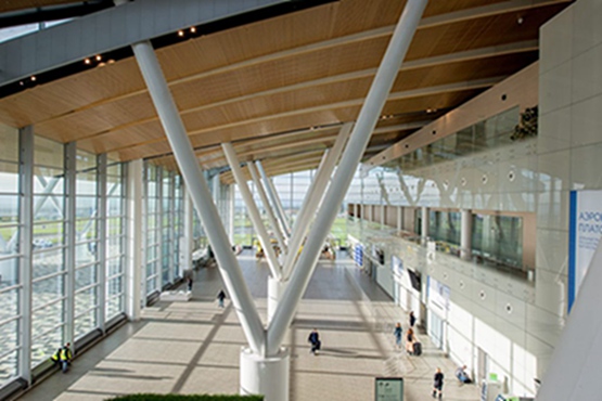 普拉托夫机场的特色是它的引人注目的屋顶,由一系列拱门构成。根据“十二建筑师事务所”的说法,该设计是一个象征——这个机场是连接许多城市和国家的“天桥”。