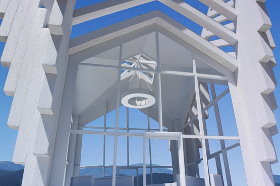 群山围绕的教堂将建在一个广场上的白色的平台上,边缘有两级台阶。