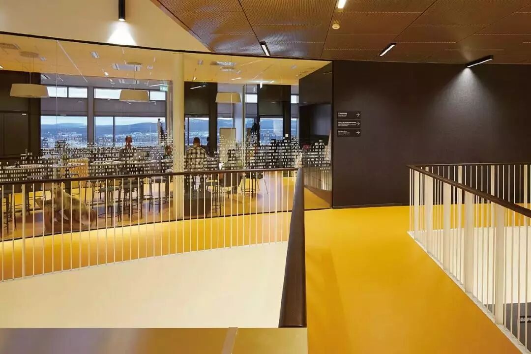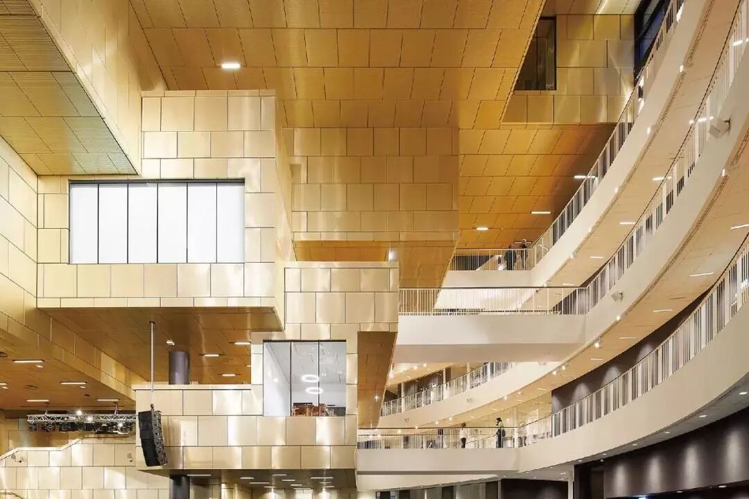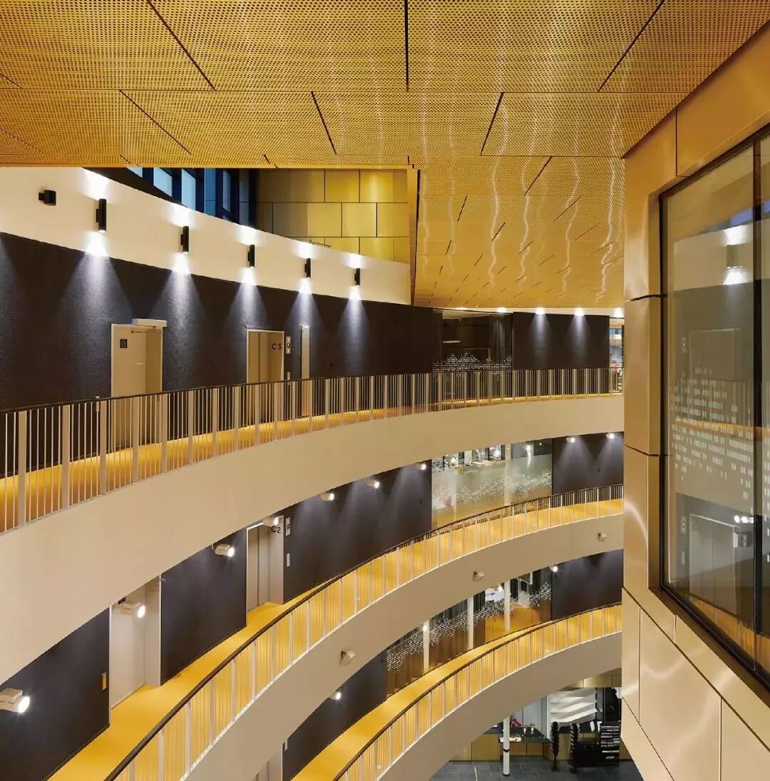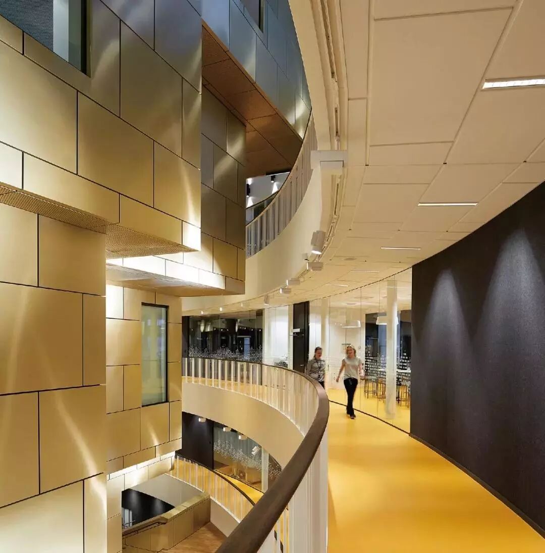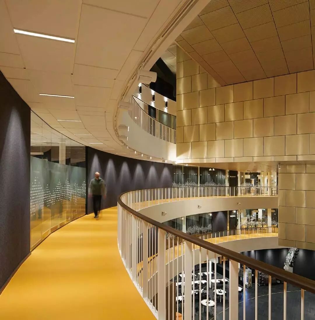 建筑外部的设计也在室内空间中创造出环形的长廊,长廊俯瞰着室内中庭,增加了人们更多交流的机会。