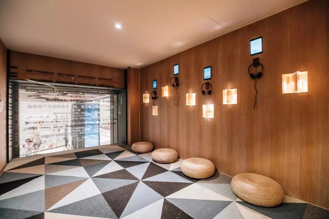 更让人惊喜的是,「晓岛」还专门开辟了一处安静的视听室,几何地板上放了几个蒲团,墙壁上错落地挂着很多视听设备,让来到这里的人们可以直接收听这些佳作,了解这位中国著名音乐人必听的经典曲目,能不能带着你重温怀旧岁月呢?