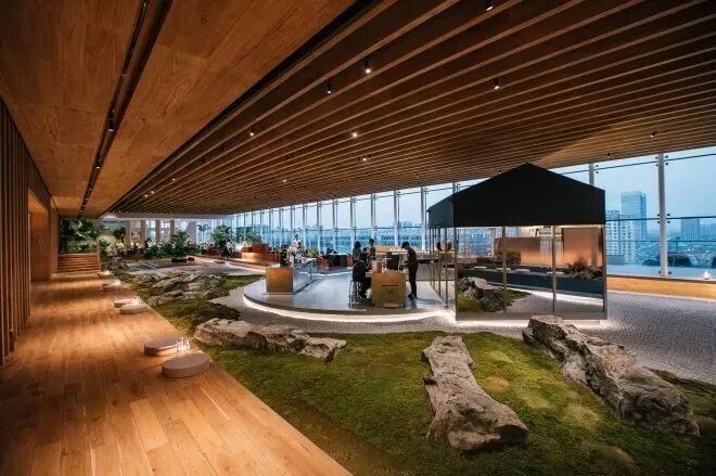 它拥有 350 平方米的圆形空间,以大量温润质朴的木元素,搭配多处灯光照明、玻璃围栏等,为室内呈现了一种通透明亮的感觉。