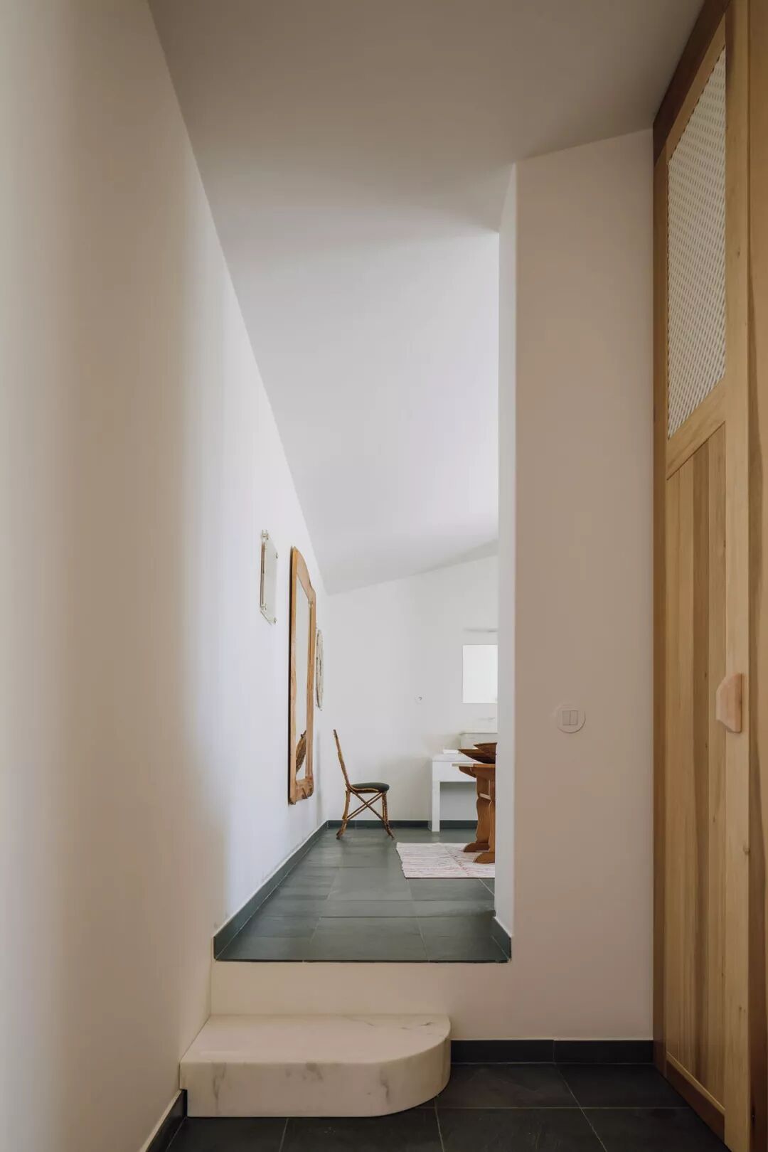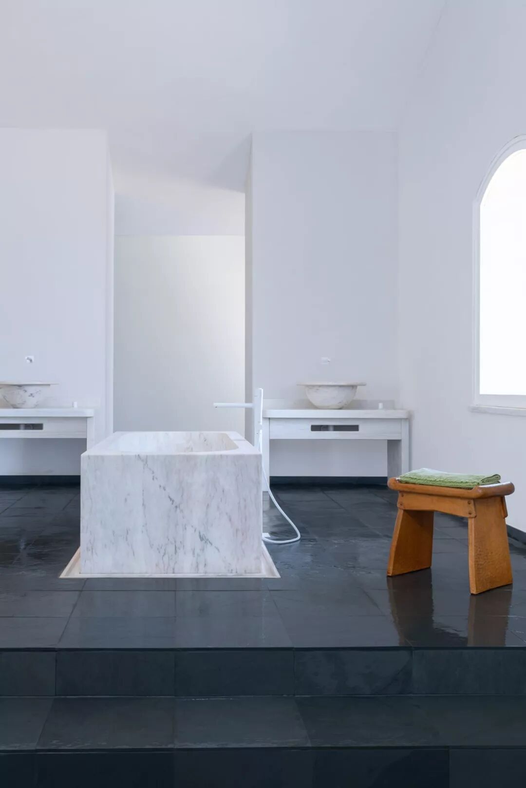 享受晶莹剔透的大理石床单的光线和色彩,反映金色的夕阳。Heinrich Eckinger的内部家具采用20世纪40年代的Anthroposophical风格,营造出宁静与和谐的感觉。