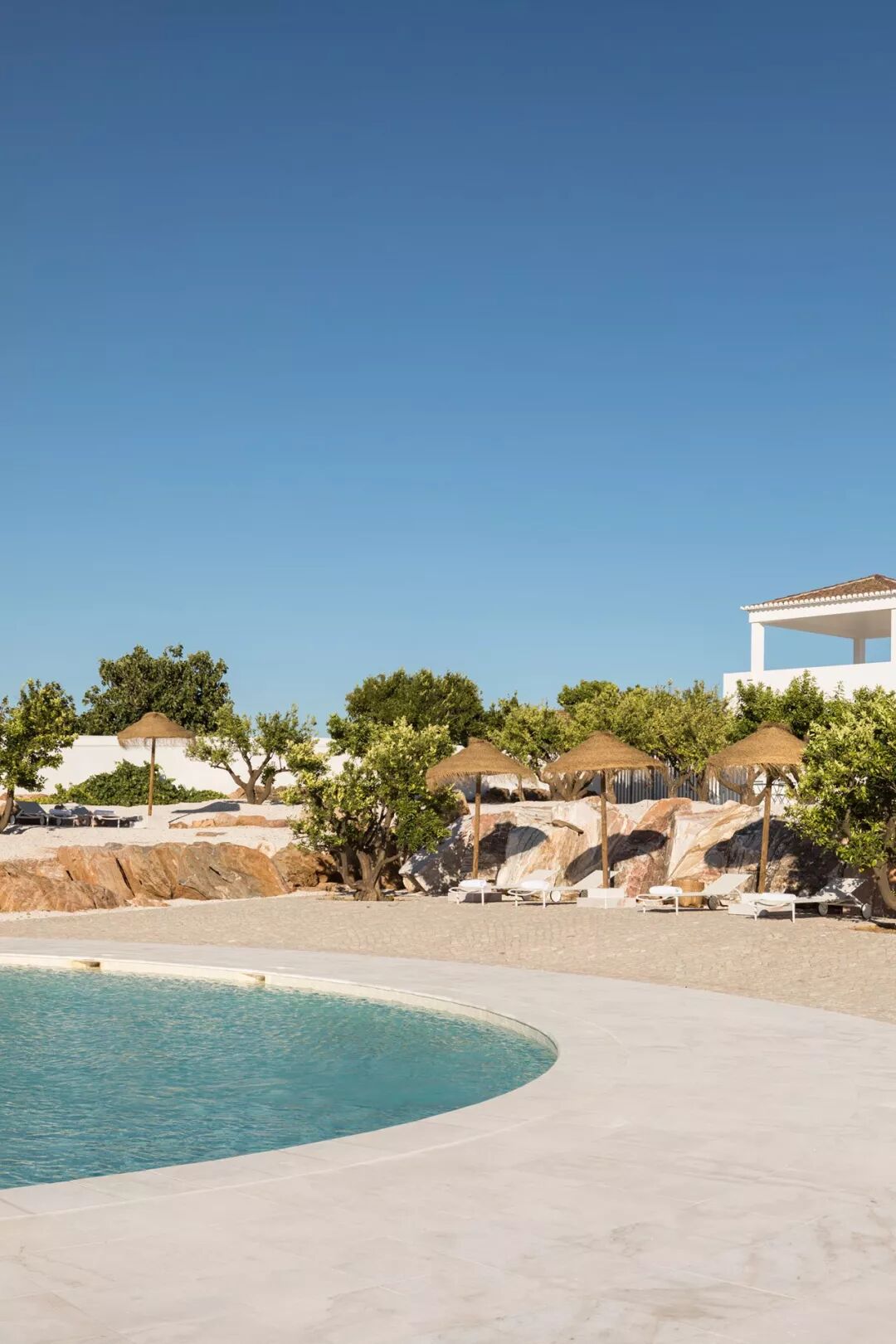 还有游泳池,在这样一个地中海地区的任何休闲场所,清新的水面都是必不可少的——即一个完美的圆形游泳池,背景是连绵起伏的丘陵,配以T形无边泳池,可欣赏展开的橄榄景色树林和几个私人泳池。