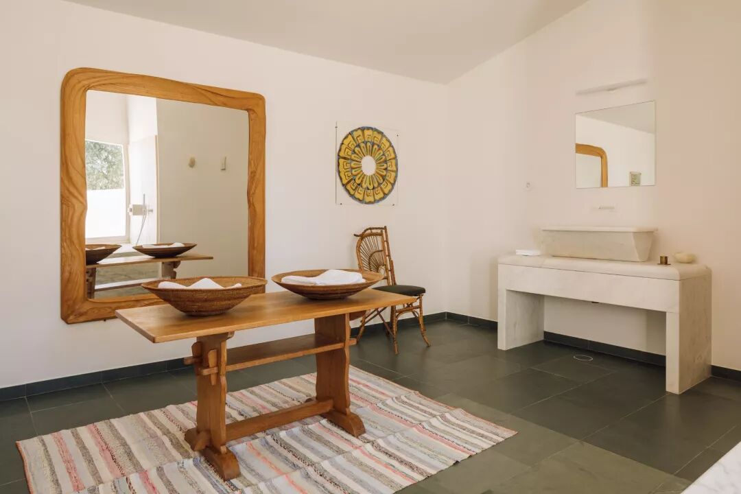 深色花岗岩地板,石灰水洗墙壁和大理石家具均采用当地采石场的白色和粉红色大理石手工雕刻而成,为各种手工制作的家具,挂毯和陶瓷提供了完美的背景,并允许酒店由于建筑织物的热质量,尽可能不再使用及空调。