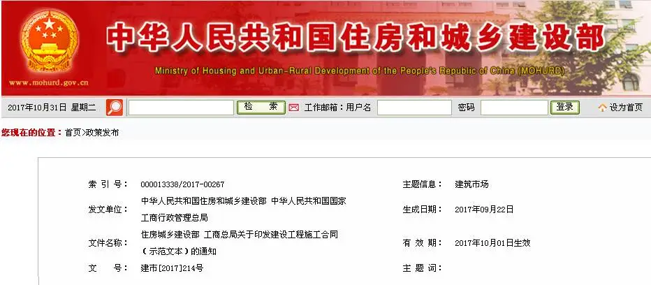 10月30日,住建部、工商总局对2013版《建设工程施工合同(示范文本)》(GF-2013-0201)进行了修订,制定了《建设工程施工合同(示范文本)》(GF-2017-0201)。2017版《建设工程施工合同(示范文本)》(GF-2017-0201)自2017年10月1日起执行,原《建设工程施工合同(示范文本)》(GF-2013-0201)同时废止。