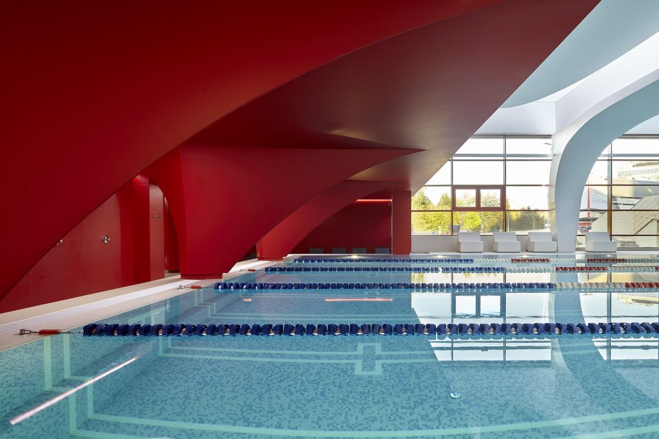 游泳池区域被分为两个主要部分:拥有低矮天花板的入口区域——红色的空间带来感官上的刺激;以及泳池所在的主区域——流线型的白色拱顶如失重般悬浮在蓝色的水面上空。灯光设计中没有使用可见的直射光源:室内光线皆为散射光,并在不同形状的宽阔表面上得到充分的反射。整个项目仅花费两个月完成。
