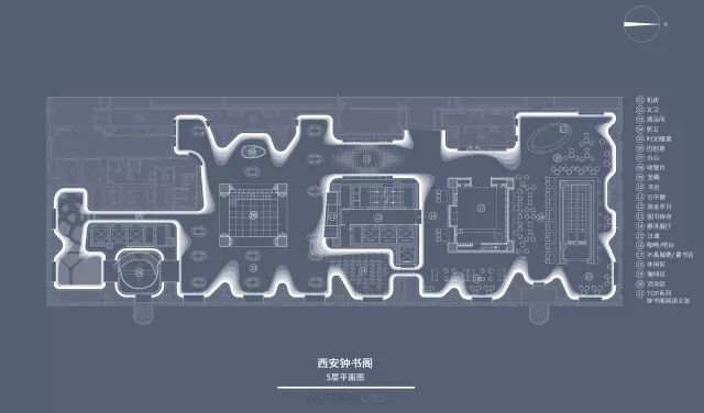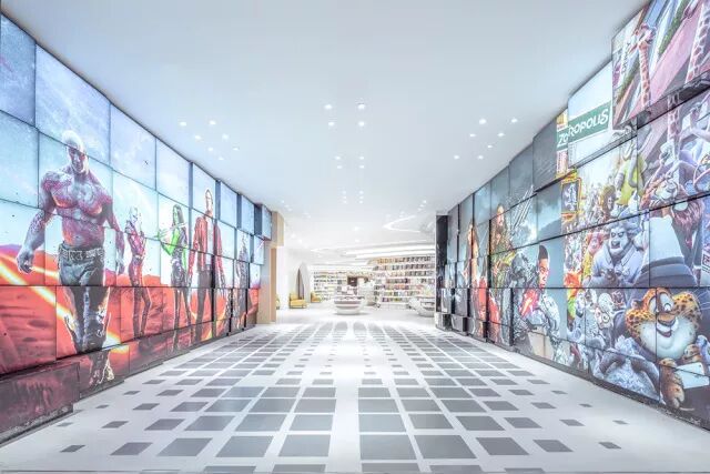 西安钟书阁保证了传统的核心购书区作为静区之外,还因为与西安中影时代国际影城的合作,于是根据影院的流线与运营结合钟书阁旗下的咖啡和简餐服务设置了动区,提供更多的餐桌与卡座。创新地将书店与影院两种文化业态在动区融合在一起。读者沿着渐变网格的地坪,在凹凸像素上的电影海报所创造的时光隧道从书店进入影院追忆似水流年。