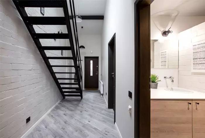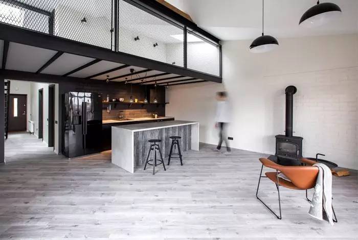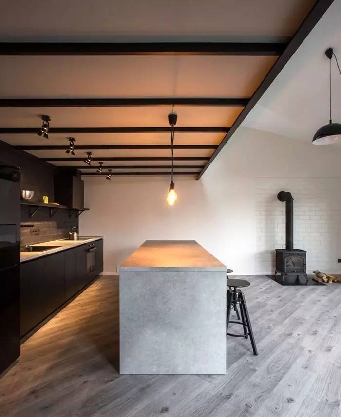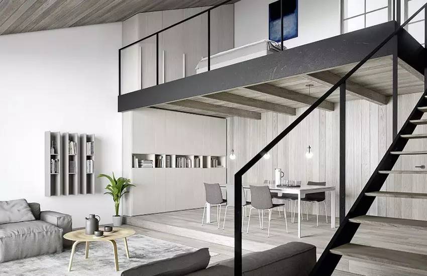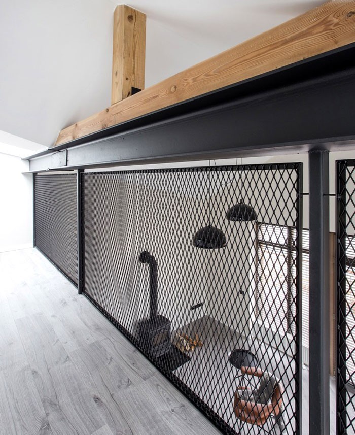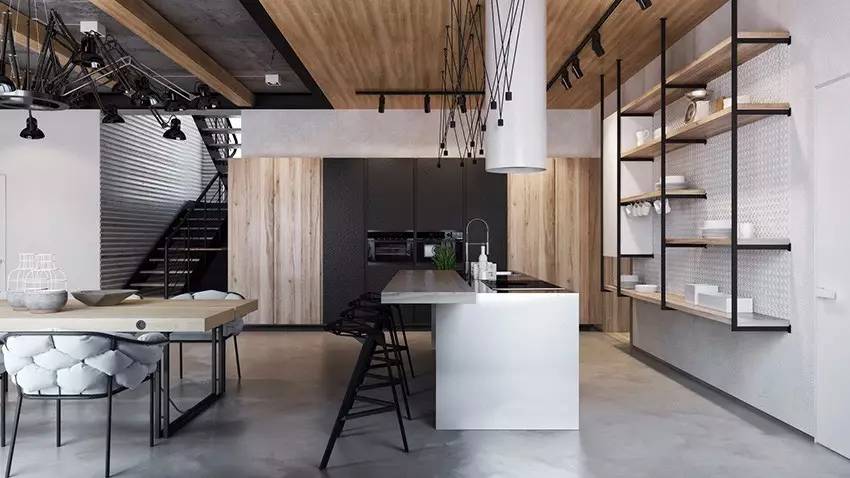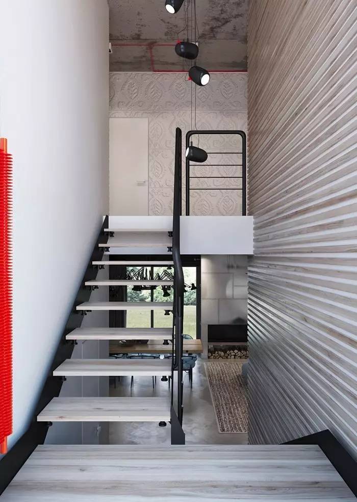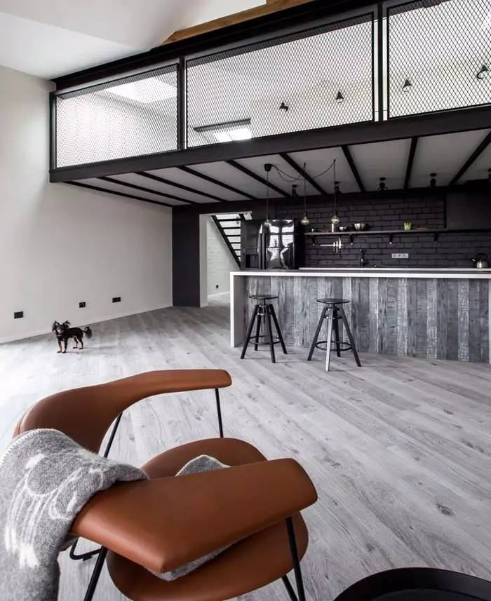 二楼网状结构隔断和黑色铁件的运用为整个空间营造了冷硬的气氛。但用暖色的木地板,加上绿植点缀,使空间更具都市现代感。
