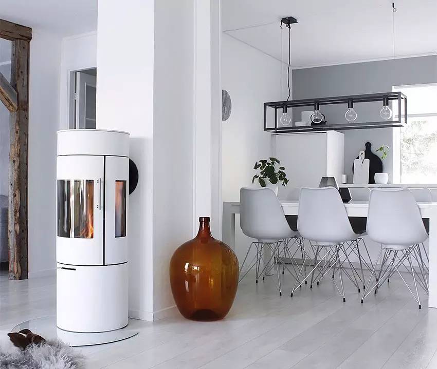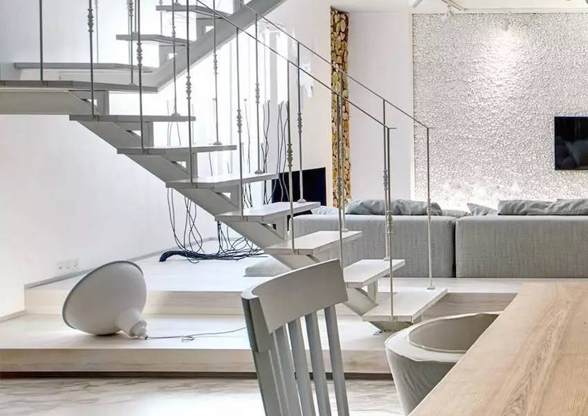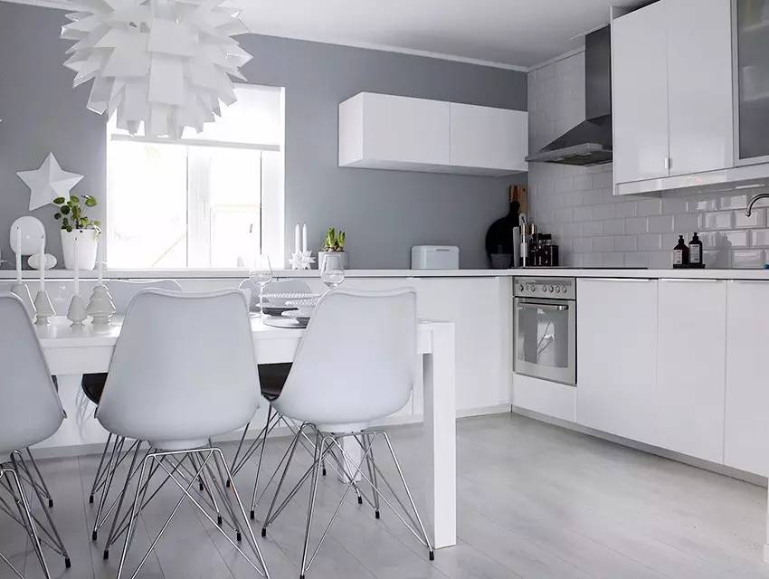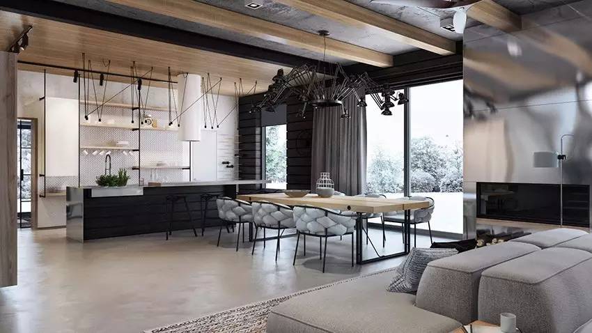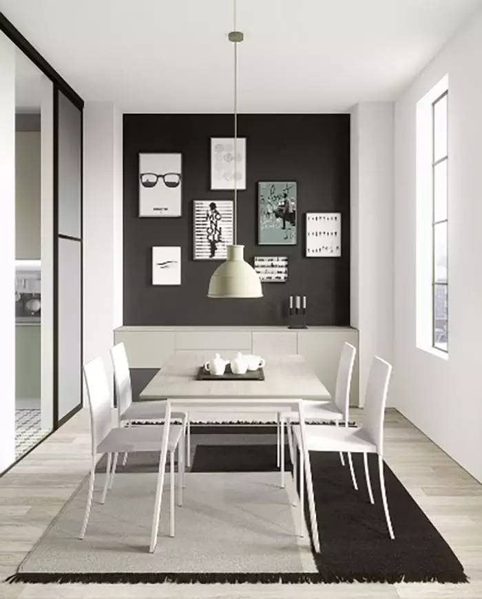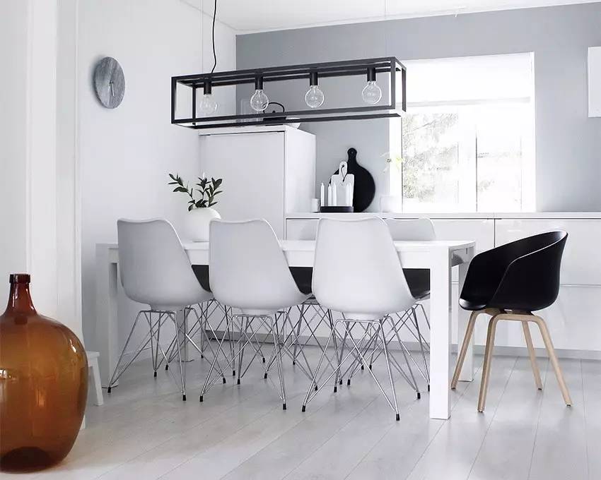 将客厅、厨房、餐厅沿着采光良好的玻璃,设计成开放式,让家中的每一处都能享受阳光大片洒进的明亮与温暖。餐厅上方的铁制吊灯与白色餐椅,更为整体简约风格带来充满线条的设计感。