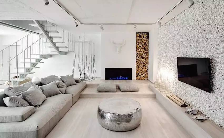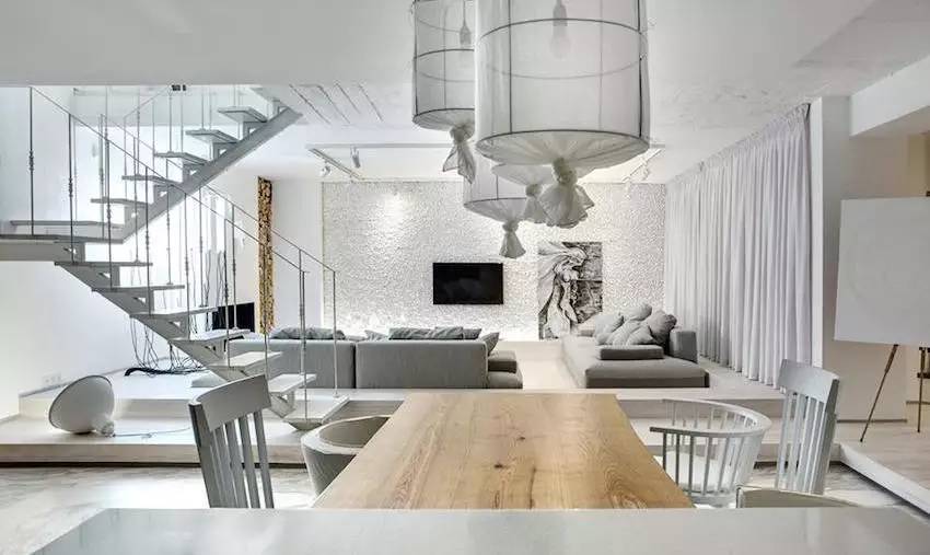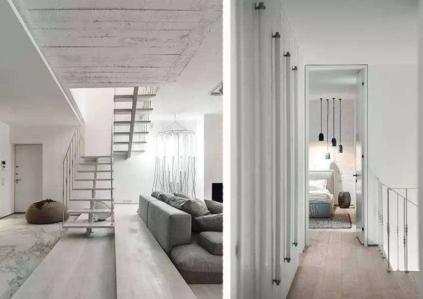 以白色为主基调,穿插木质或金属提升空间质感与层次感,使整体空间清爽、明亮;天花板垂吊的造型灯饰,搭配走道上与墙边点亮的蜡烛,用多光源为空间补上满满暖意和生活味。
