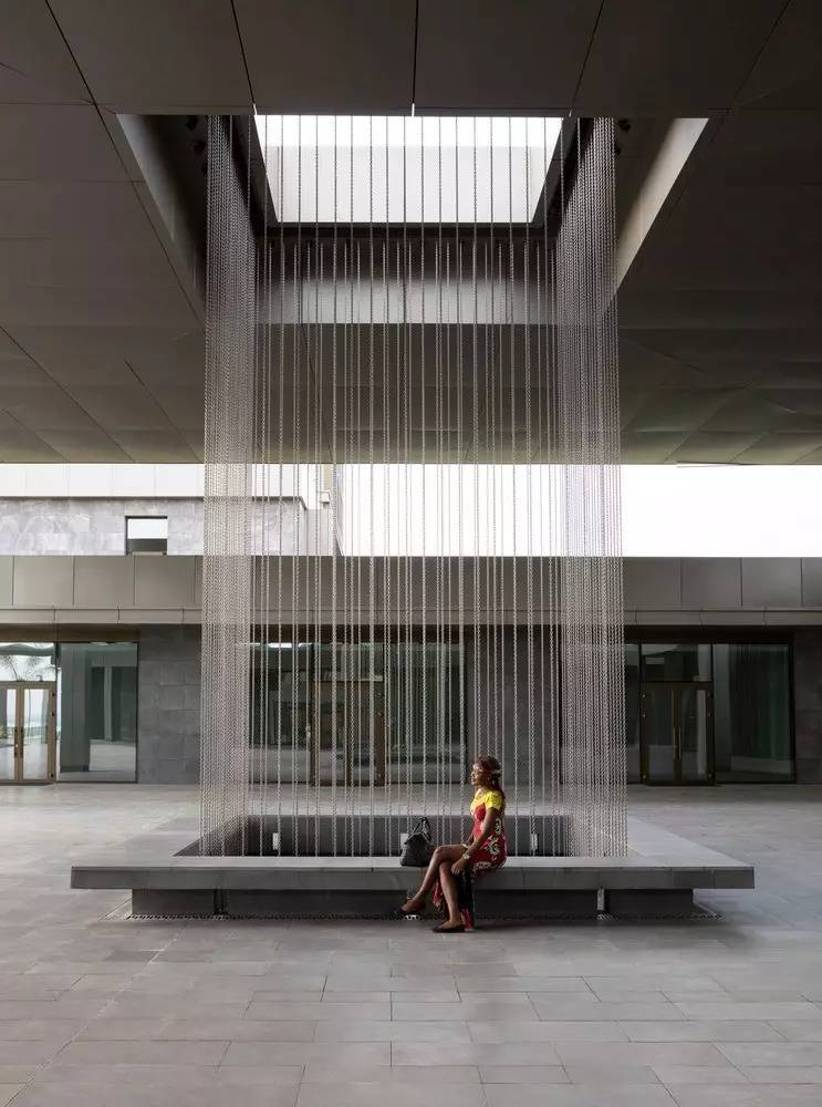 夜晚,长廊柱子被地埋灯洗亮, 棚顶的筒灯照亮着地面,整个区域灯火通明。多于6个月的全年雨是刚果一直存在的气候现象。因此,重要的设计方向是当人们在室外空间时,庇护人们免受雨水的影响,但是不是远离自然。庇护空间不仅对避雨有要求,空气流通这方面的考虑也是必不可少的。