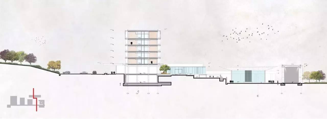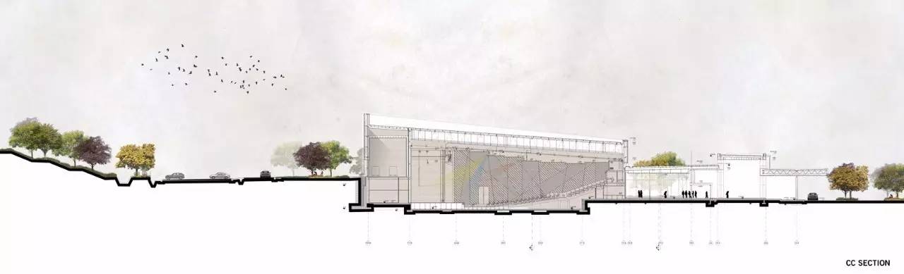 350米长的连廊还可以作为线性公共空间,庇护人们不受流雨的影响。连廊的两端也作为公共门洞连接着整个建筑综合设施。连接着公共连廊的两端是新闻厅的西门和博物馆的东门。东端博物馆连接着广场南端。商店和公共餐厅分别位于广场的北部和东部边缘。中部镂空广场的棚顶庇护着这个开放空间不受雨水影响,同时棚顶使得雨水落在广场中心的浅池中。
