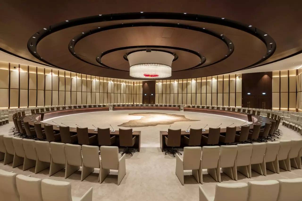 国会大厅的主照明使用筒灯下照,大厅两边墙壁安装了线条灯及内镶灯来装饰,最后在厅边缘增加一圈射灯,作为点缀。总统大厅的照明则简单一些,筒灯照亮地面后用吊灯来增加厅内气势,最后同样用一圈射灯来点缀。