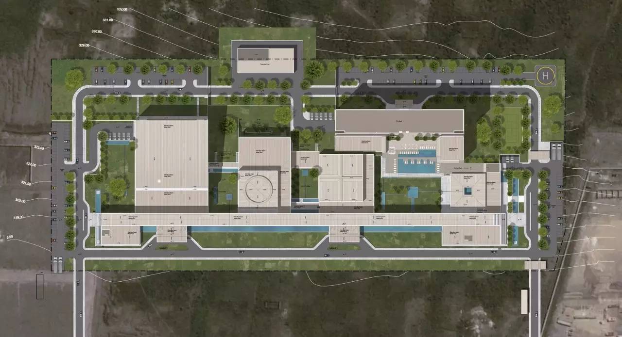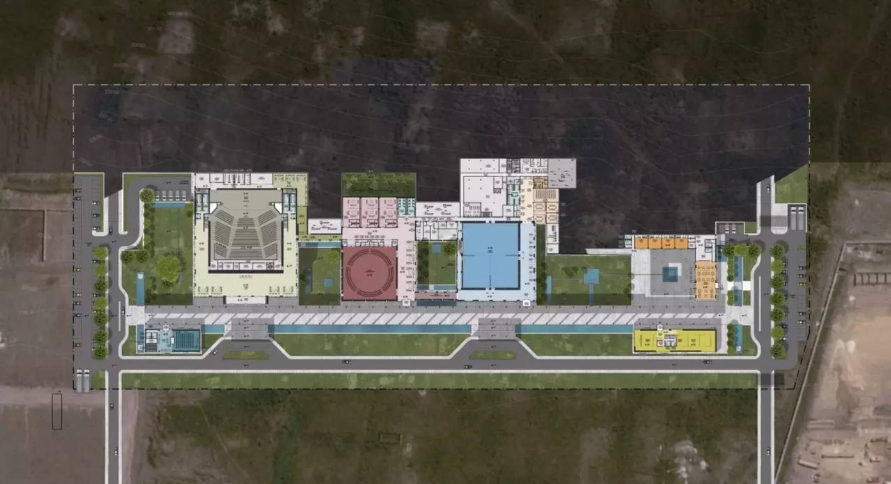 在场地内,建筑物的朝向很大程度上是由地形决定的。我们尽量减少过度开挖和迁移土层而对地形造成的影响。这个项目的设计主体是能够容纳1500人的国会大厅, 300人的总统大厅, 1000人的宴会厅和1000人的公共广场。公共广场被设计成线性,与庭院相结合,都连接着带顶连廊。