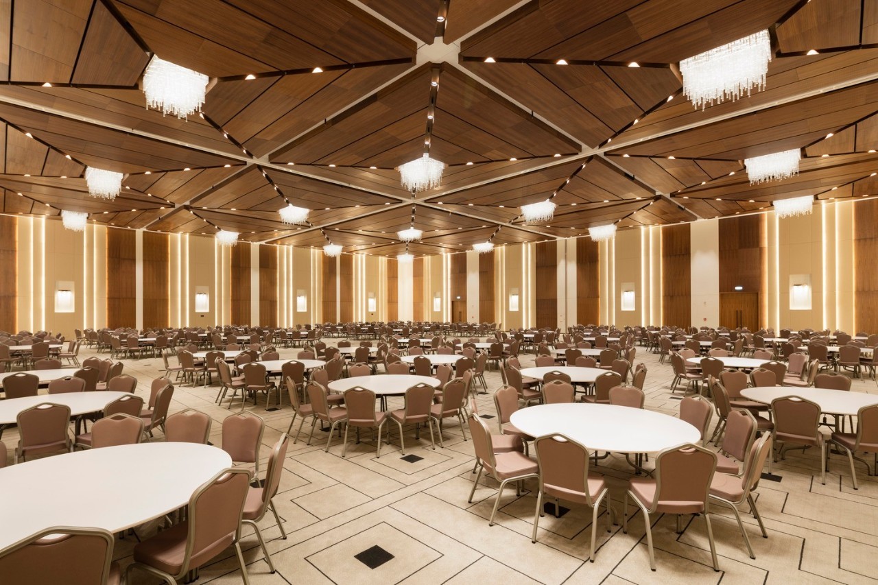 宴会厅天花造型独特,天花被无数个正方形分割,在方形中心安装了一个小吊灯。筒灯则安装在吊灯四周,墙壁上每隔2米就有壁灯点缀。