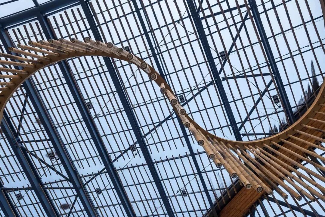 另一方面,建筑以竹子作为围护体系,竖向支撑排列既富有一种序列美,又相当于钢索对上方结构产生反向拉力,最终达到一种矛盾抵消的结构平衡。