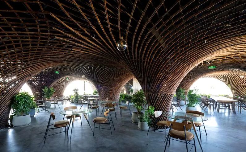 在较低的楼层,这家咖啡馆总共有14根竹柱,部分竹柱将混凝土结构掩藏了起来。这些柱子将空间分割成不同的私人区域,创造出一种仿佛进入竹林洞穴的神奇体验。