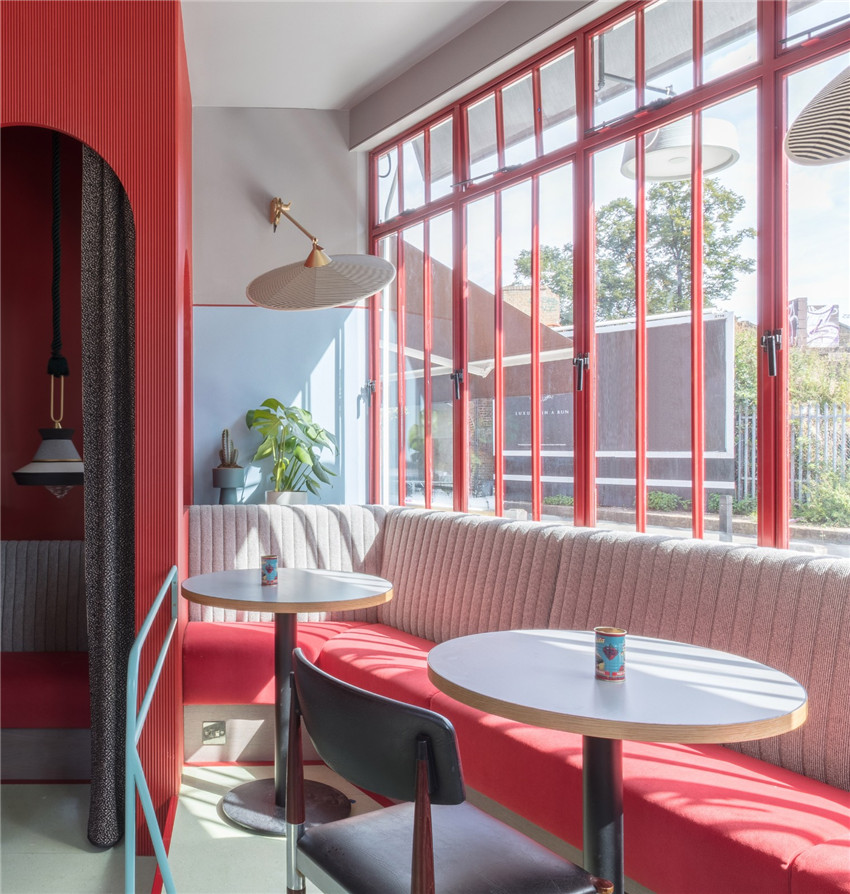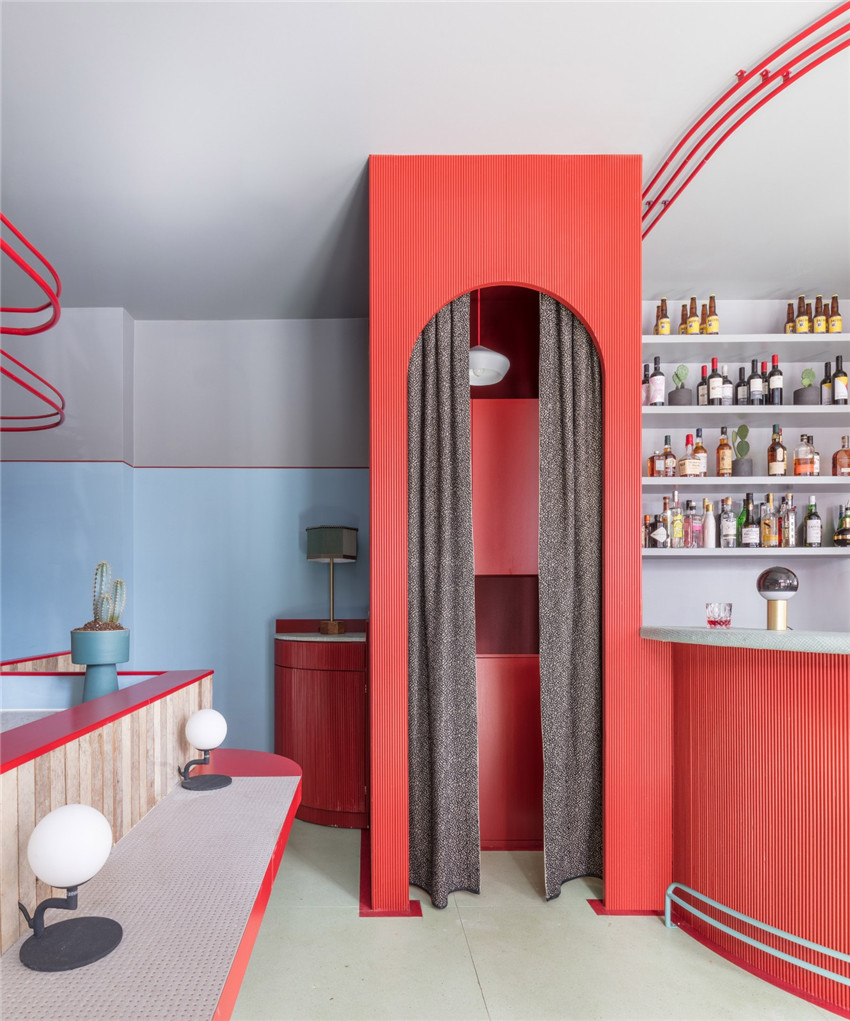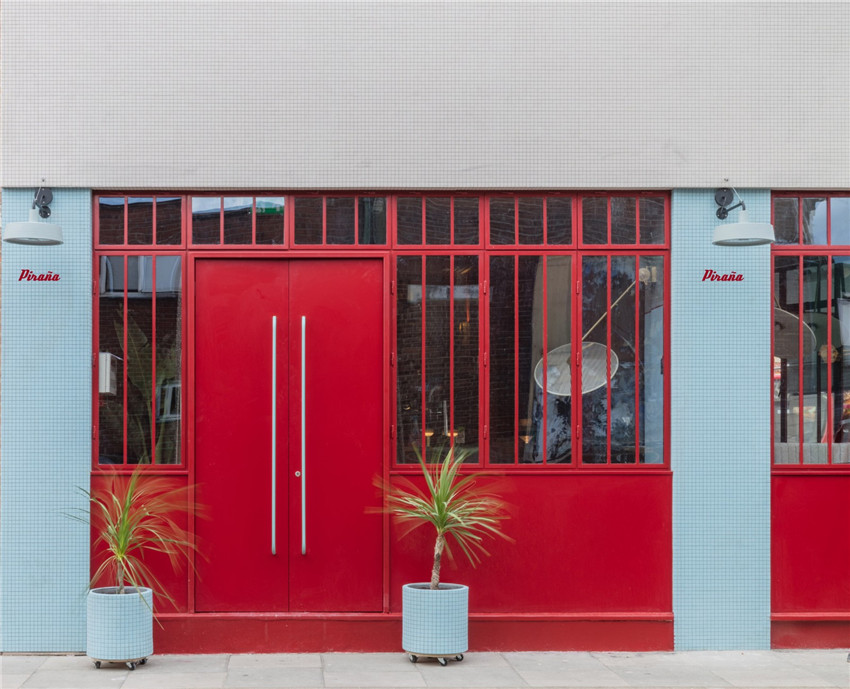 这家餐厅的色彩和材质都带有大胆的对比色和纹理。例如,在立面上,蓝色和白色的马赛克瓷砖被设置在红色的金属窗框上,而定制的玉水磨石地板与泥土的红色装饰和在吧台上的弯曲的木板相冲突。设计师们说:“除了椅子和灯光,pirana的每一件家具和家具都是由Sella概念定制的,包括展位、酒吧、长凳、桌子、凳子、地板和浴室盥洗池。”